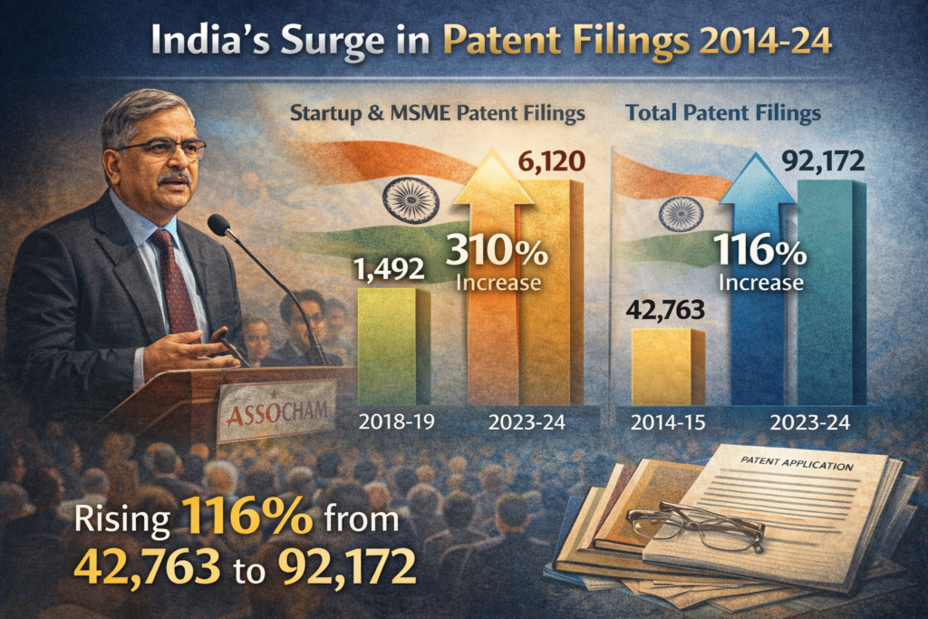 • Steady growth: India has witnessed more than 90,000 patent filings annually (2022–23), compared to nearly 45,000 a decade ago.