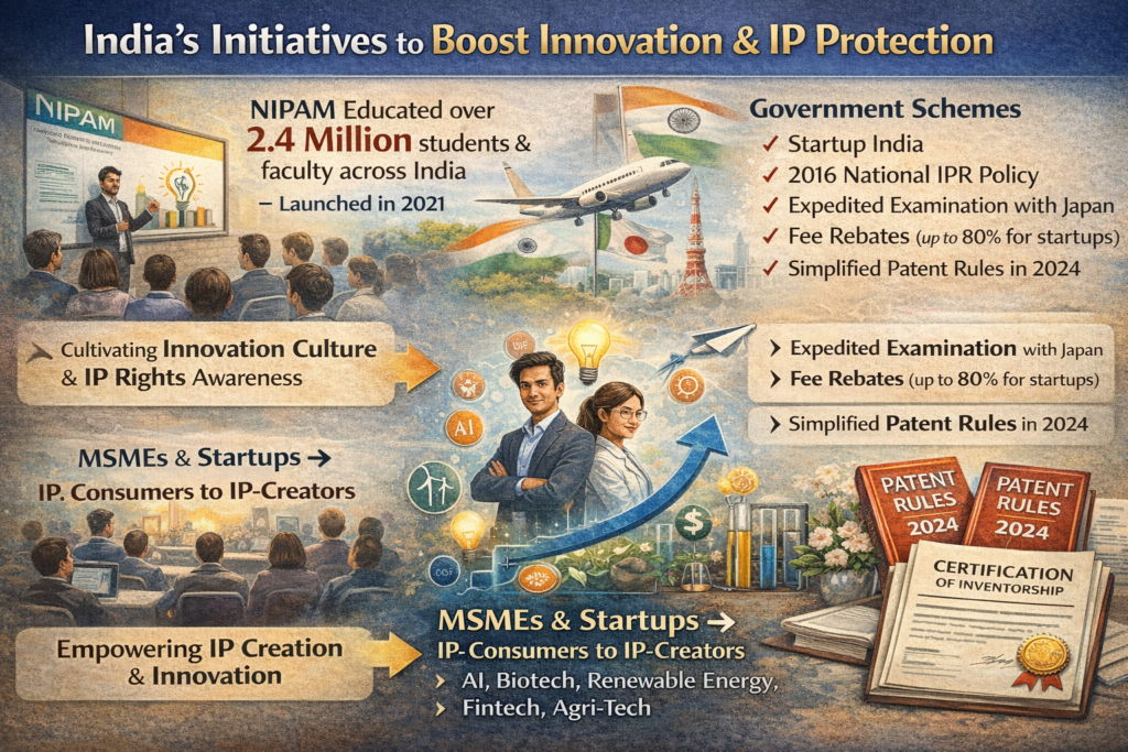 • Incentives: 80% fee rebates for startups, MSMEs, women entrepreneurs, and educational institutions along with expedited examination.