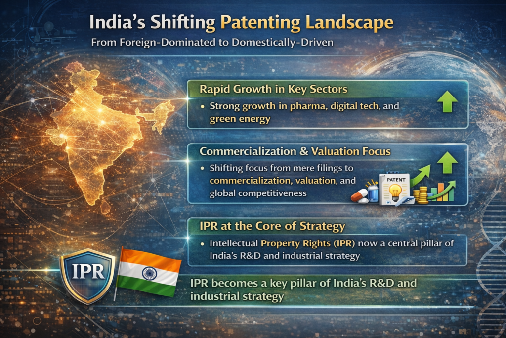 India’s patenting landscape is transitioning from being foreign-dominated to domestically driven, with strong growth in pharma, digital tech, and green energy. The focus is shifting from mere filings to commercialization, valuation, and global competitiveness, making IPR a central pillar of India’s R&D and industrial strategy.