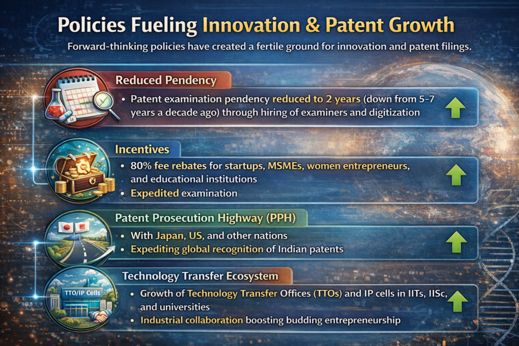 • Key drivers: Startups, academia–industry collaborations, and incentives under Atmanirbhar Bharat and the National IPR Policy (2016)
